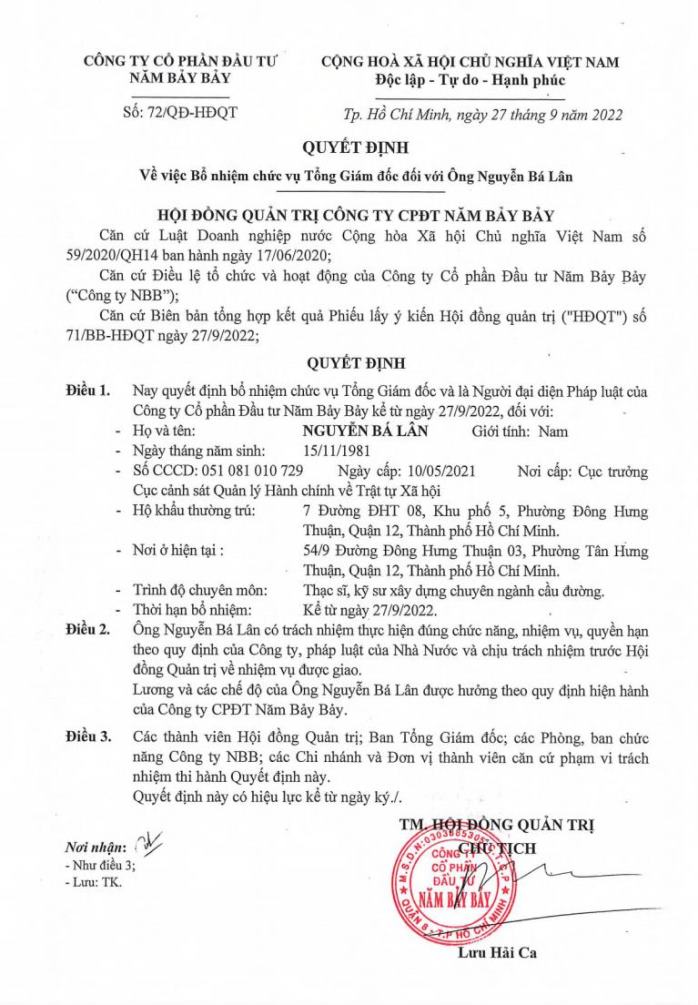 CBTT – Bổ nhiệm Tổng Giám đốc đối với ông Nguyễn Bá Lân
