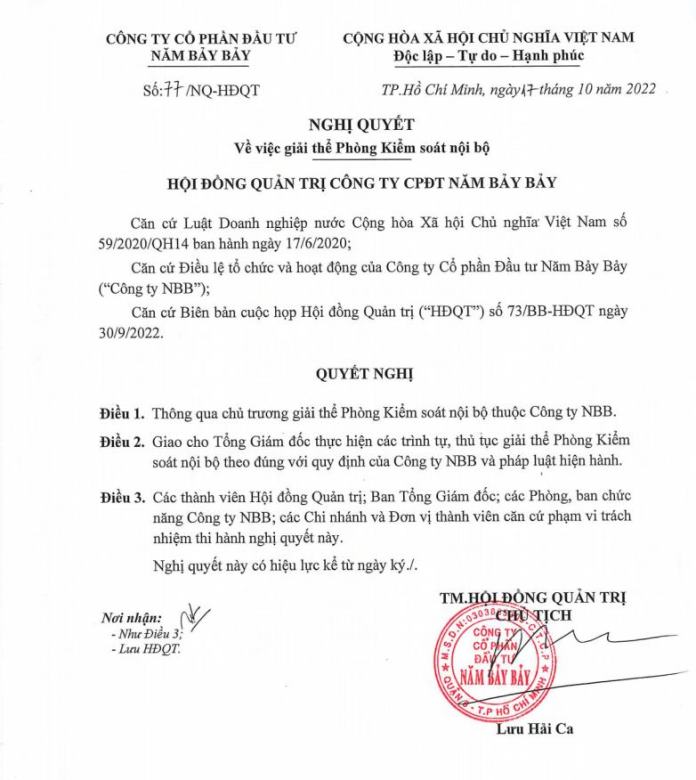 CBTT – Nghị quyết HĐQT v/v giải thể phòng Kiểm soát Nội bộ