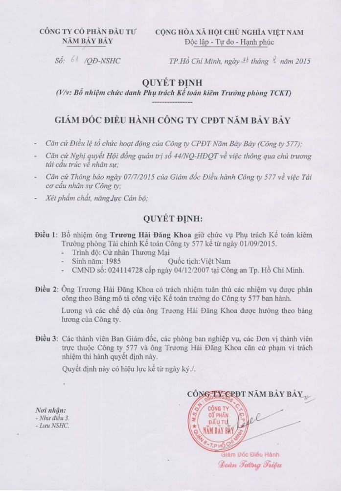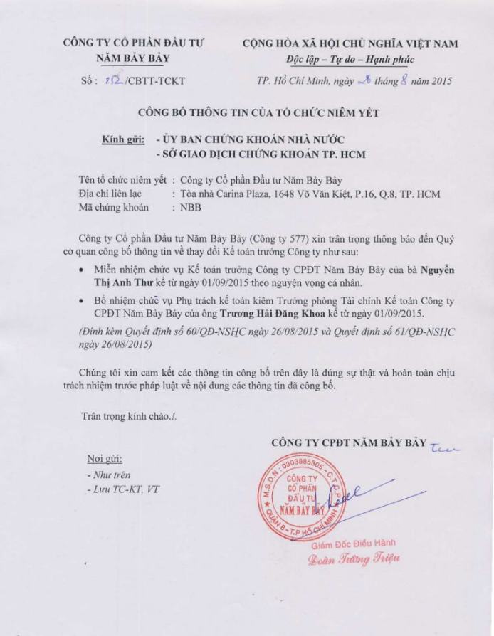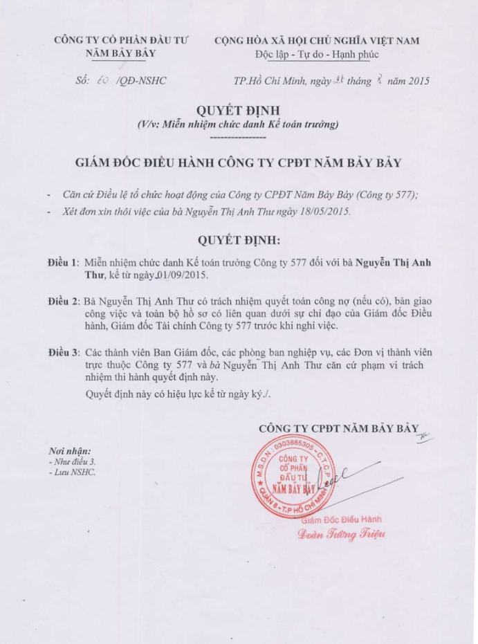 CBTT v/v Dismissal and appointment of the Chief Accountant