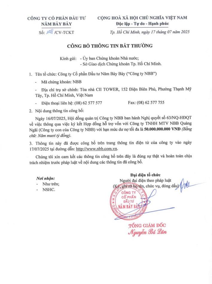 Trang chủ - Tin cổ đông - Nghị quyết HĐQT thông qua việc ký kết hợp đồng hỗ trợ vốn cho Công ty NBB Quảng Ngãi